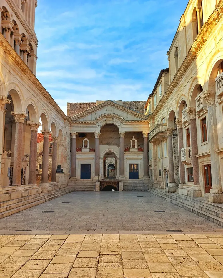 Diocletian’s Palace is an ancient palace built for the Roman emperor Diocletian at the turn of the fourth century AD, which today forms about half the old town of Split, Croatia. While it is referred to as a “palace” because of its intended use as the retirement residence of Diocletian, the term can be misleading as the structure is massive and more resembles a large fortress: about half of it was for Diocletian’s personal use, and the rest housed the military garrison.