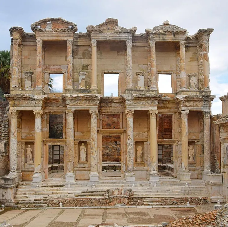 The Library of Celsus is an ancient Roman building in Ephesus, Anatolia, now part of Selçuk, Turkey. The building was commissioned in the 110s A.D. by a consul, Gaius Julius Aquila, as a funerary monument for his father, former proconsul of Asia Tiberius Julius Celsus Polemaeanus, and completed during the reign of Hadrian, sometime after Aquila’s death. The library is considered an architectural marvel and is one of the only remaining examples of a library from the Roman Empire. The Library of Celsus was the third-largest library in the Roman world behind only Alexandria and Pergamum, believed to have held around twelve thousand scrolls.