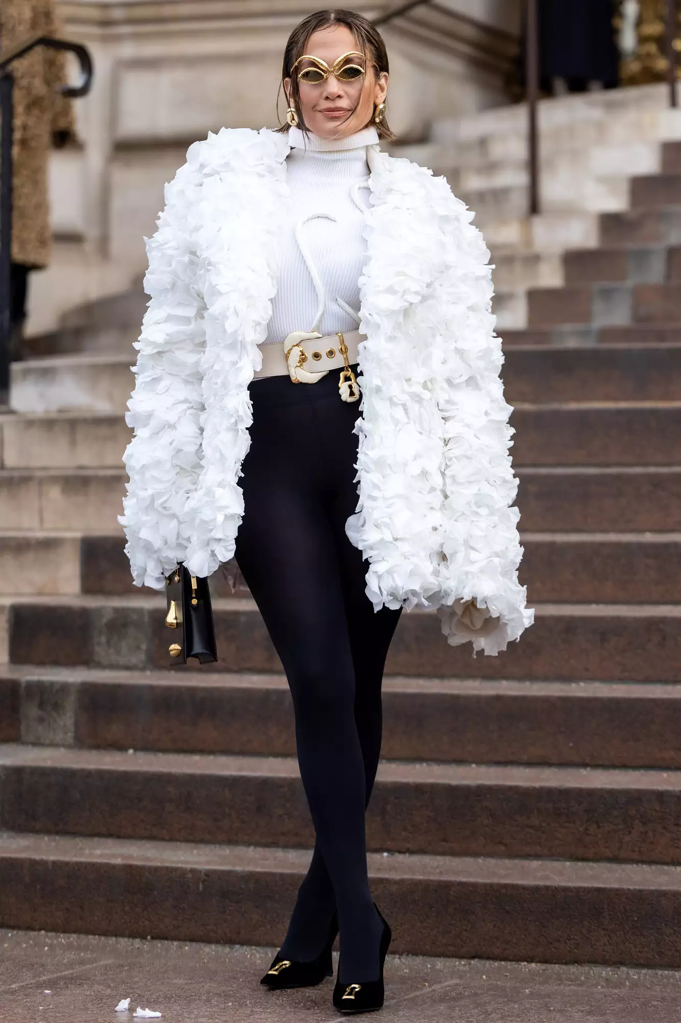 Lopez wore a striking custom Schiaparelli look featuring a white turtleneck sweater with sculptural detailing, black high-waisted leggings and a jacket made up of real white rose petals with a large sun embroidered in silver sequins on the back, stylist Mariel Haenn shared on Instagram.