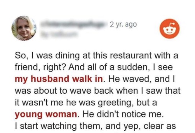 While dining with her friend Janet, Sandra spots Mark with a young woman at a restaurant, raising suspicions of infidelity. Janet suggests gathering evidence before confronting him.