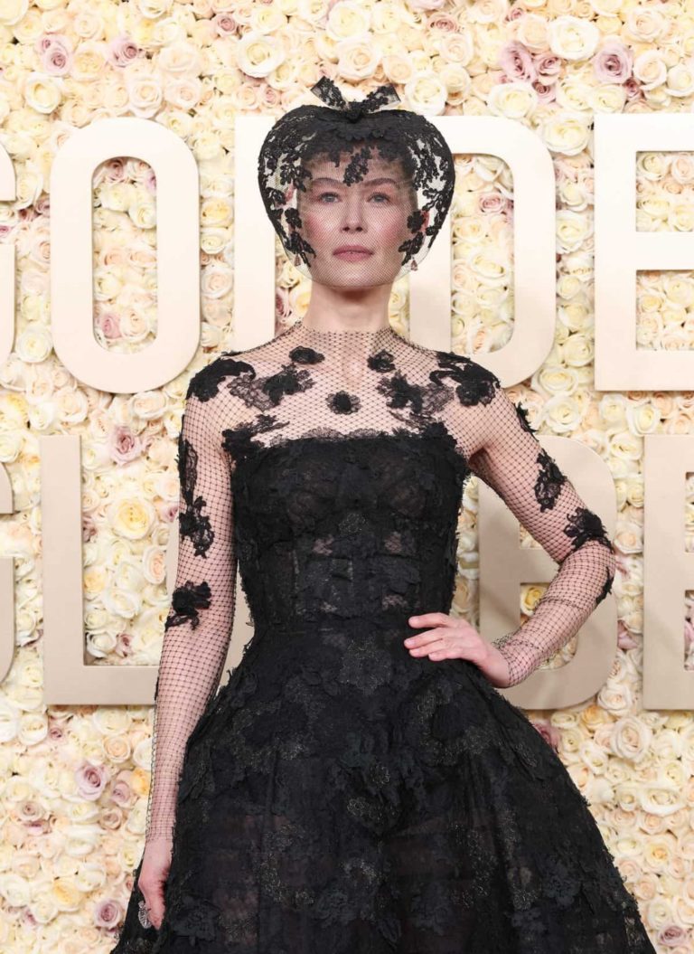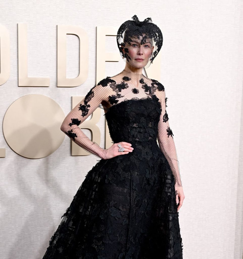 And, of course, Rosamund Pike could not help but show up on the Golden Globes red carpet. In addition, the choice of outfit becomes clear. You see, the star’s stylist decided to focus on an image that would be equally suitable for both Rosamund and her heroine in the film “Saltburn” – Felix’s mother. The archival Dior Couture fall-winter 2019 collection came to the rescue. It was not without reason that the lace dress with floral details attracted attention.