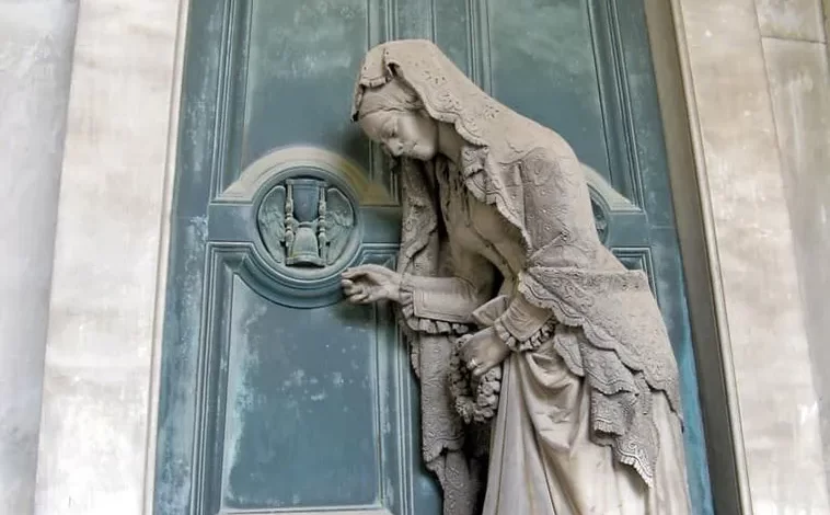 In this poignant artwork created in 1875 by Giovanni Battista Cevasco, a widow is depicted knocking on death’s door with one hand, while holding a wreath of victory in the other. The wreath symbolizes triumph over death, representing resurrection and renewal.