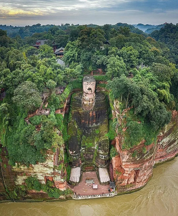 The Leshan Giant Buddha is a 71-meter (233 ft) tall stone statue, built between 713 and 803 (during the Tang dynasty). It is carved out of a cliff face of Cretaceous red bed sandstones that lies at the confluence of the Min River and Dadu River in the southern part of Sichuan province in China, near the city of Leshan. The stone sculpture faces Mount Emei, with the rivers flowing below its feet. It is the largest and tallest stone Buddha statue in the world and it is by far the tallest pre-modern statue in the world.