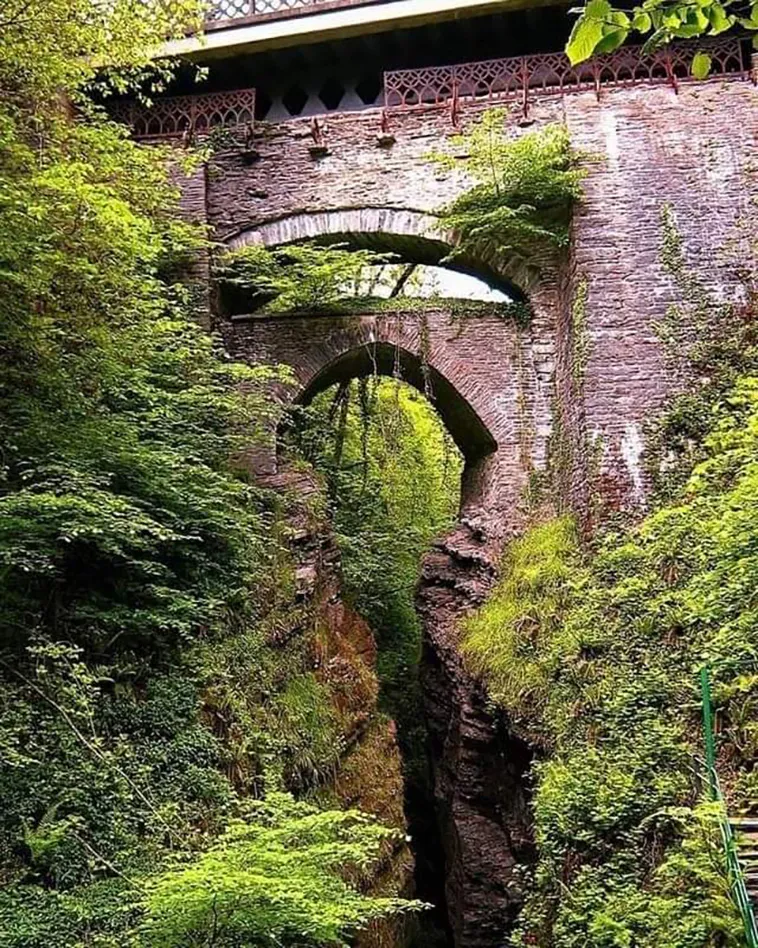 The Devils Bridge in Ceredigion, Wales, comprises three bridges built on top of each other, dating from 1100, 1753 and 1901.