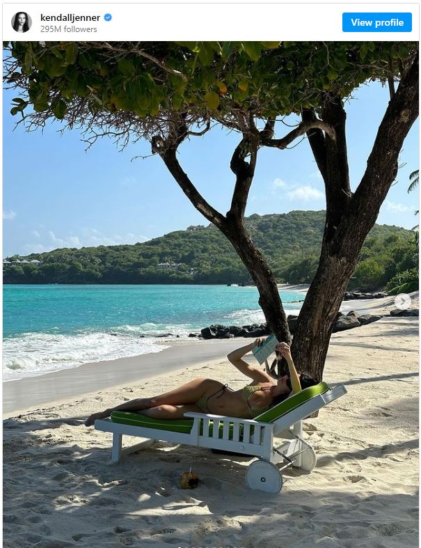 Multiple photos in the post show Jenner posing in a cheeky yellow thong bikini while she lounges on the beach with a book. The background reveals stunning turquoise waters and white sand beaches at the island destination. She captioned the post with a simple coconut emoji.