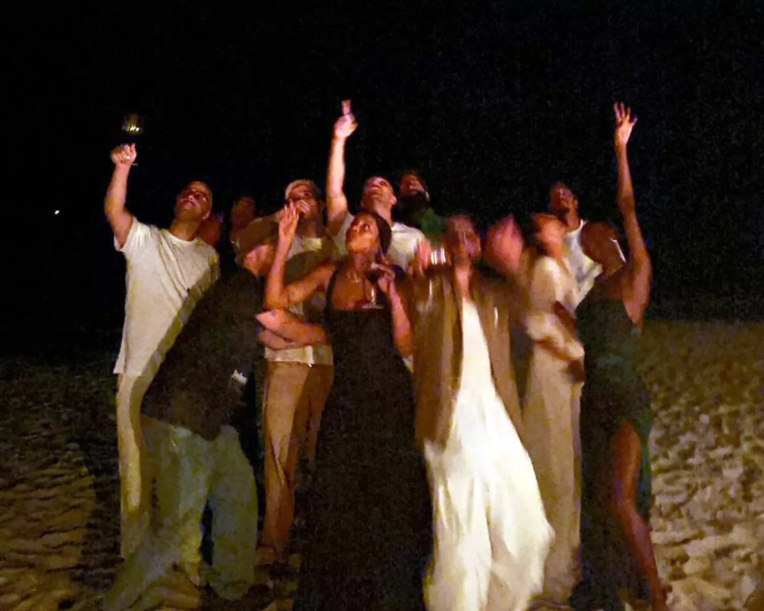 Along with some beachside lounging, Jenner also shared a snap of her friends who joined her on the trip. In one photo, the group huddles together and looks up at the night sky, followed by another shot of a dazzling fireworks display.