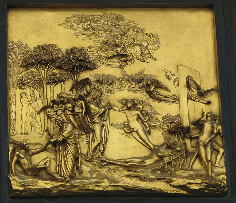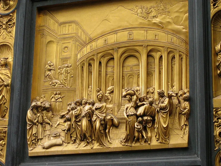 Golden doors with scenes from the Old Testament. Near Baptistry Duomo Santa Maria del Fiore, Florence, Italy
