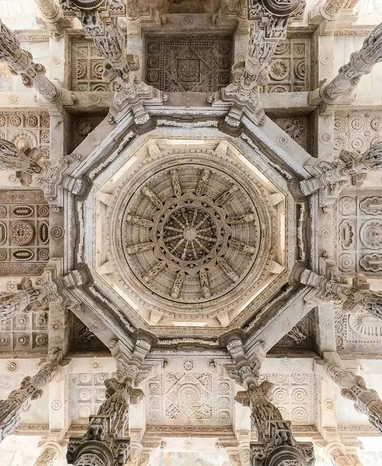 Ranakpur Jain Temple features the Māru-Gurjara architecture style. This style of temple architecture originated in Gujarat and Rajasthan from the 11th to 13th centuries. Interiors of this style are mostly decorated with elaborate carvings such as “flying” arch-like structures between pillars. The low domes of Jain temples also have carvings with a very intricate rosette design.