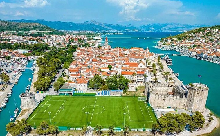 Igralište Batarija is a football pitch in Trogir, Crotia. It is the home stadium of the Croatian football team HNK Trogir, founded in 1912. What makes Igralište Batarija famous is the fact that it is nestled between two UNESCO World Heritage Sites that are under protection: Kamerlengo Castle behind the south goal, and St. Marco Tower behind the north goal, both of which are 15th-century fortresses. The Adriatic Sea borders the stadium.