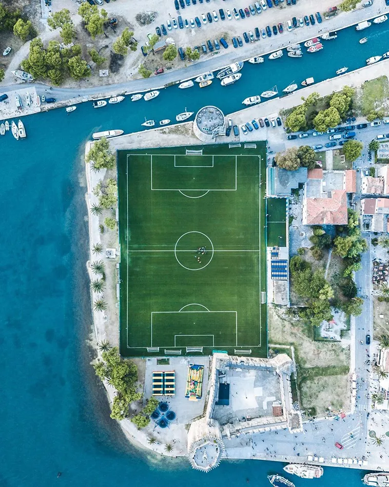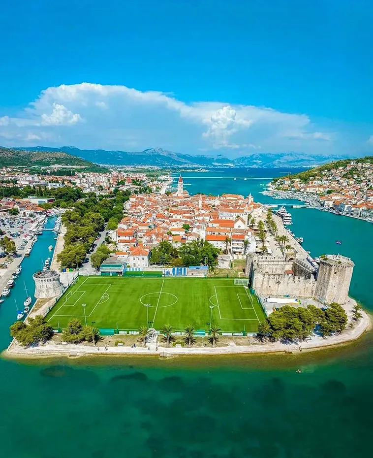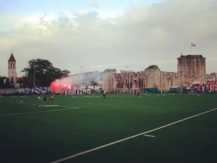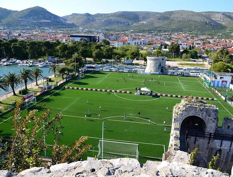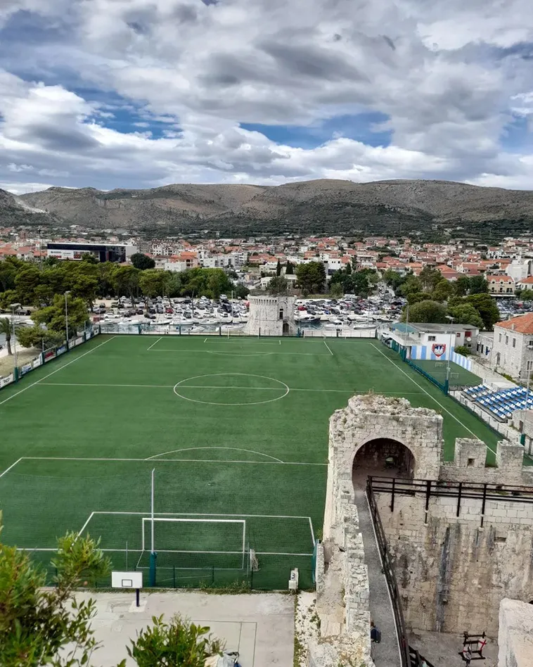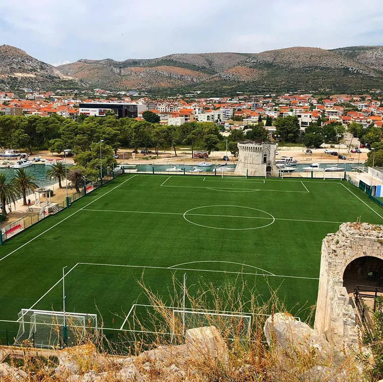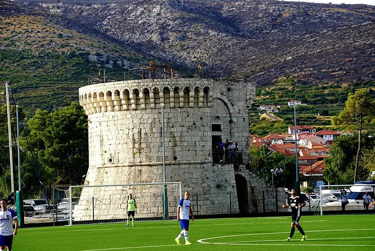 Igralište Batarija is a football pitch in Trogir, Crotia. It is the home stadium of the Croatian football team HNK Trogir, founded in 1912. What makes Igralište Batarija famous is the fact that it is nestled between two UNESCO World Heritage Sites that are under protection: Kamerlengo Castle behind the south goal, and St. Marco Tower behind the north goal, both of which are 15th-century fortresses. The Adriatic Sea borders the stadium.