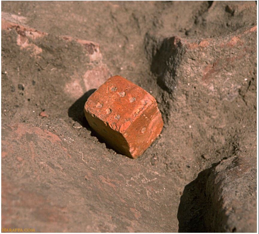 A cubical die with 1 to 6 dots was found in rubble during excavations at Harappa between 1995 and 2001. Many dice were also found at Mohenjo-daro, and John Marshall writes: “That dicing was a common game at Mohenjo-daro is proved by the number of pieces that have been found.