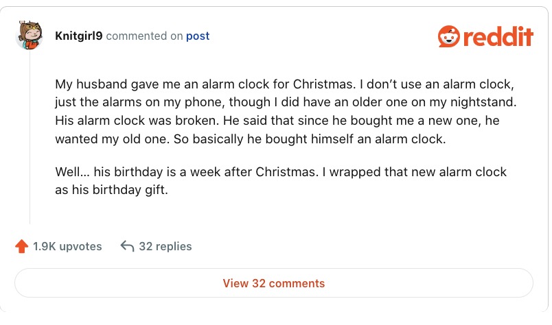 People on Reddit were inspired to share their own Christmas gift horror stories. One woman shared that she received an alarm clock from her husband for Christmas because his alarm clock was broken.