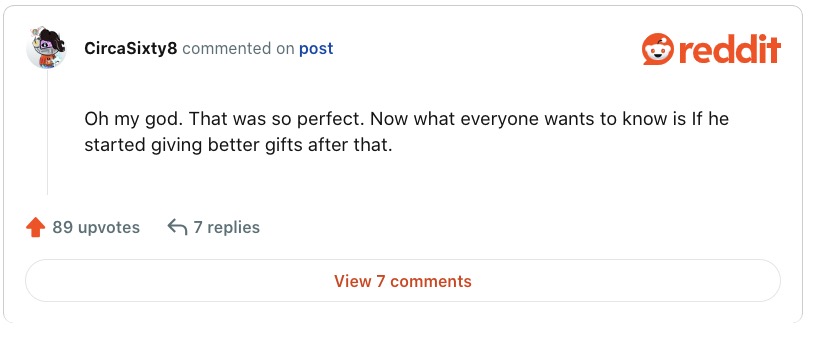 When one person asked whether the woman’s husband improved on his gift-giving after her toilet paper revenge, she admitted that her husband never gave her a gift after that, and he passed away two years later.