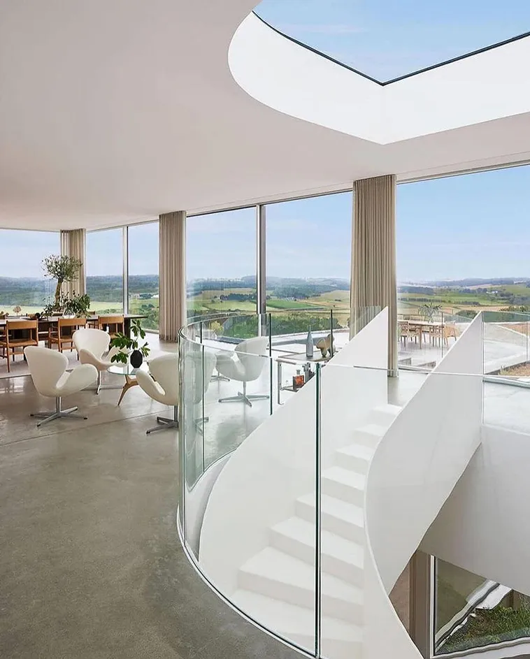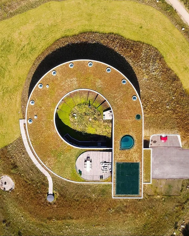 Designed by Bjarke Ingels Group, Villa Gug curves in a loop around the top of a small hill, framing a central courtyard that functions as a private garden. This snail-shaped dwelling in Aalborg, Denmark has been specifically configured to contain and showcase the client’s range of high-end automobiles. The form of the 750-square-metre building will create an extension of the driveway. The first section is proposed as a glazed garage that showcases the cars, but the loop then continues to provide the bedrooms and living spaces of the family home.