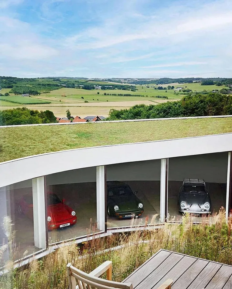 “In Villa Gug, the clients’ passion for cars plays a significant role in the family life, taking up a significant portion of the housing area,” said BIG in a statement. “Instead of hiding the vehicle away in a basement, or a large garage, we suggest a house that smoothly turns from car to home… The building’s character gradually changes from an introverted garage and showroom at the driveway to the more open functions, including kitchen, living room, and terrace on the top of the building,”