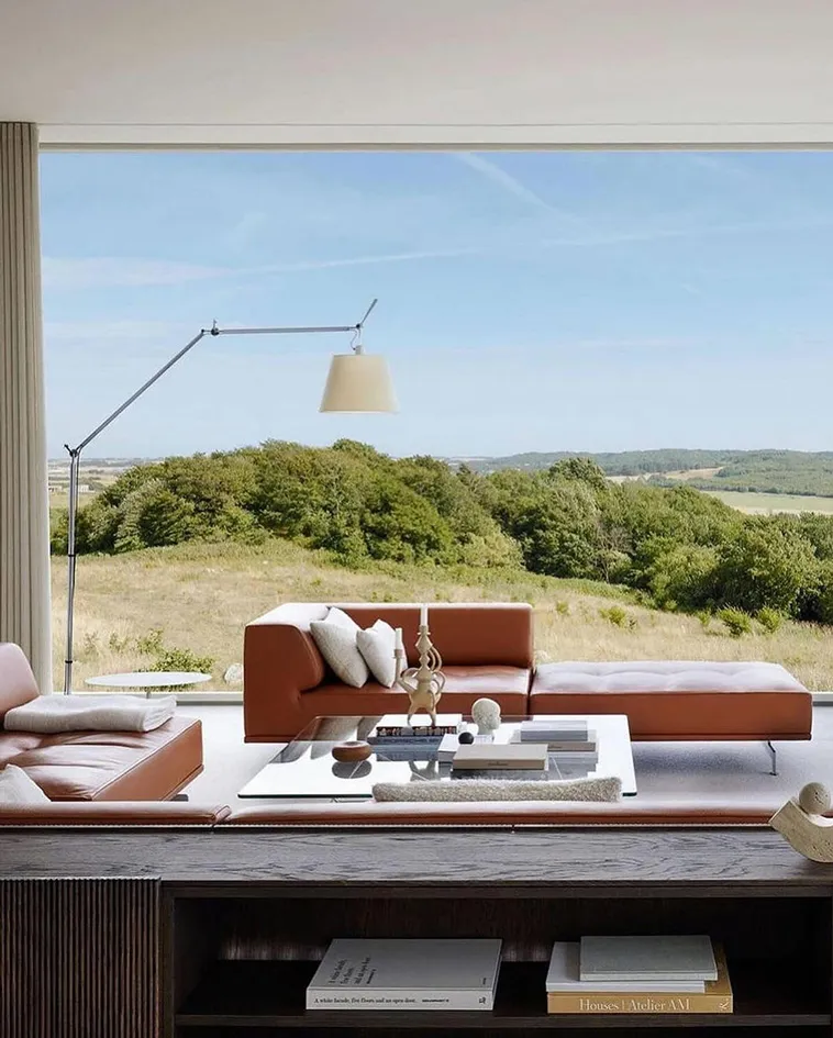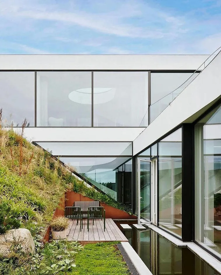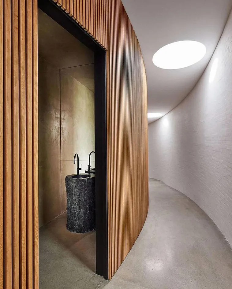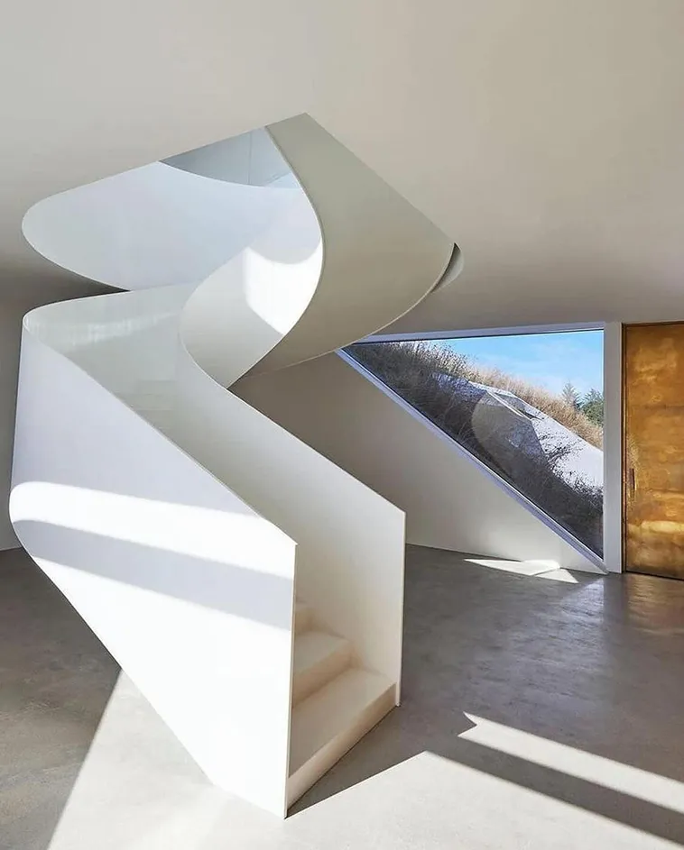 Access is done through what looks like a traditional garage door, but which is actually the start of the house, shaped very much like a wide concrete hallway. The hallway moves up the hills and curves, spilling into separate parking spaces that, from the outside, are seen like cubicles that hold individual vehicles. It then loops and becomes the main family home, with each room offering great views to these cubicles; they’re also visible from the exterior relaxation areas. In total, the house offers a living space of 840 square meters (9,041 square feet), which combines parking spots and living areas.