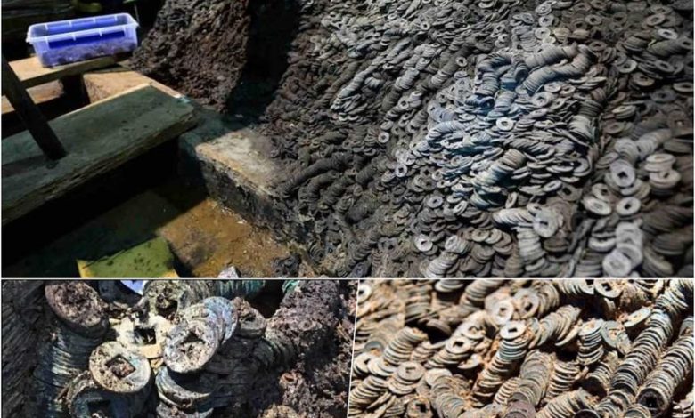 The ancient money, which bears Chinese symbols, characters, and a square hole at its centre, were found at a dig site in the city of Nanchang, China.