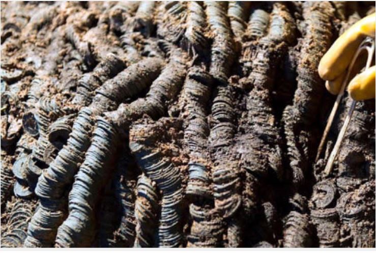 The ancient money, which bears Chinese symbols, characters, and a square hole at its centre, were found at a dig site in the city of Nanchang, China.