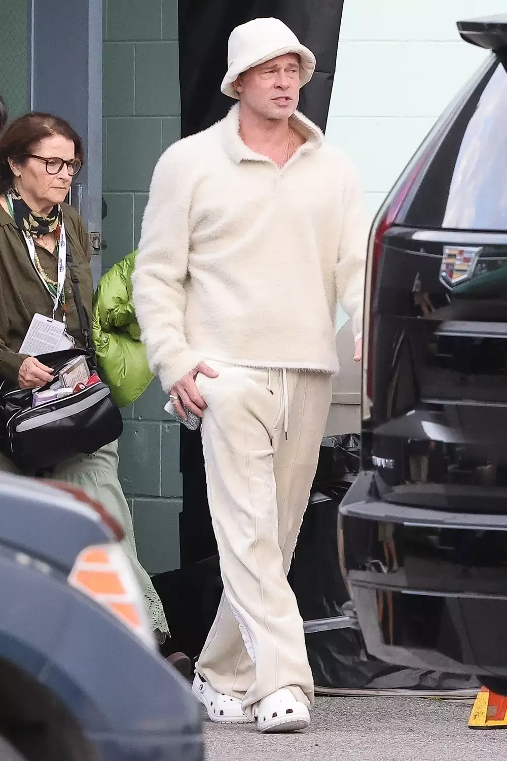 The Babylon star wore his comfy shoes with an even comfier outfit: a matching fuzzy sweat set in an off-white shade and a padded bucket hat (another trendy piece!) in the same hue. Pitt may have just turned 60 but he is seemingly doing everything he can to stay hip to the times. It’s not the style of his younger years, but we all evolve as we age.