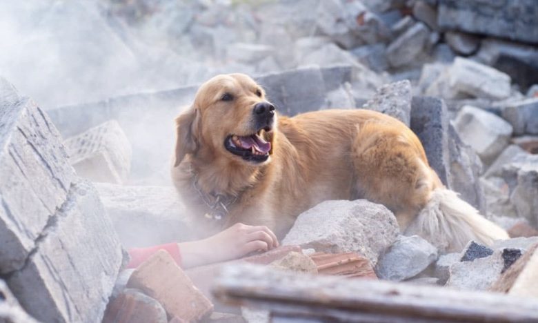 The debris, once part of homes and livelihoods, becomes a race of obstacles for this furry hero. The dog’s acute senses, finely tuned to the smell of its human companion, guide it through the maze of fallen structures. Its eyes, filled with a silent plea for help, speak volumes about the urgency of the situation and the dire need for human intervention.