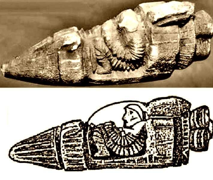 According to Sitchin’s book “The Earth Chronicles Expeditions,” the rock item is a carved scale replica of a spaceship. 24cm in length, 9cm in height, and 8cm in width. At the back of the monster, he mentioned a massive exhaust engine flanked by four smaller exhaust engines. The pilot of the rocket spacecraft had disappeared.
