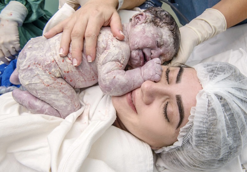 This is the tender moment a baby is born and places on his mum to meet herCredit: сoⱱeг Images LS