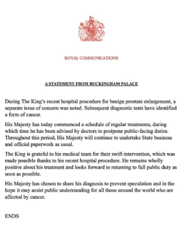 His Majesty has begun a regular treatment schedule and has been advised to postpone public-facing duties. He will, however, continue to handle State business and official paperwork as usual.