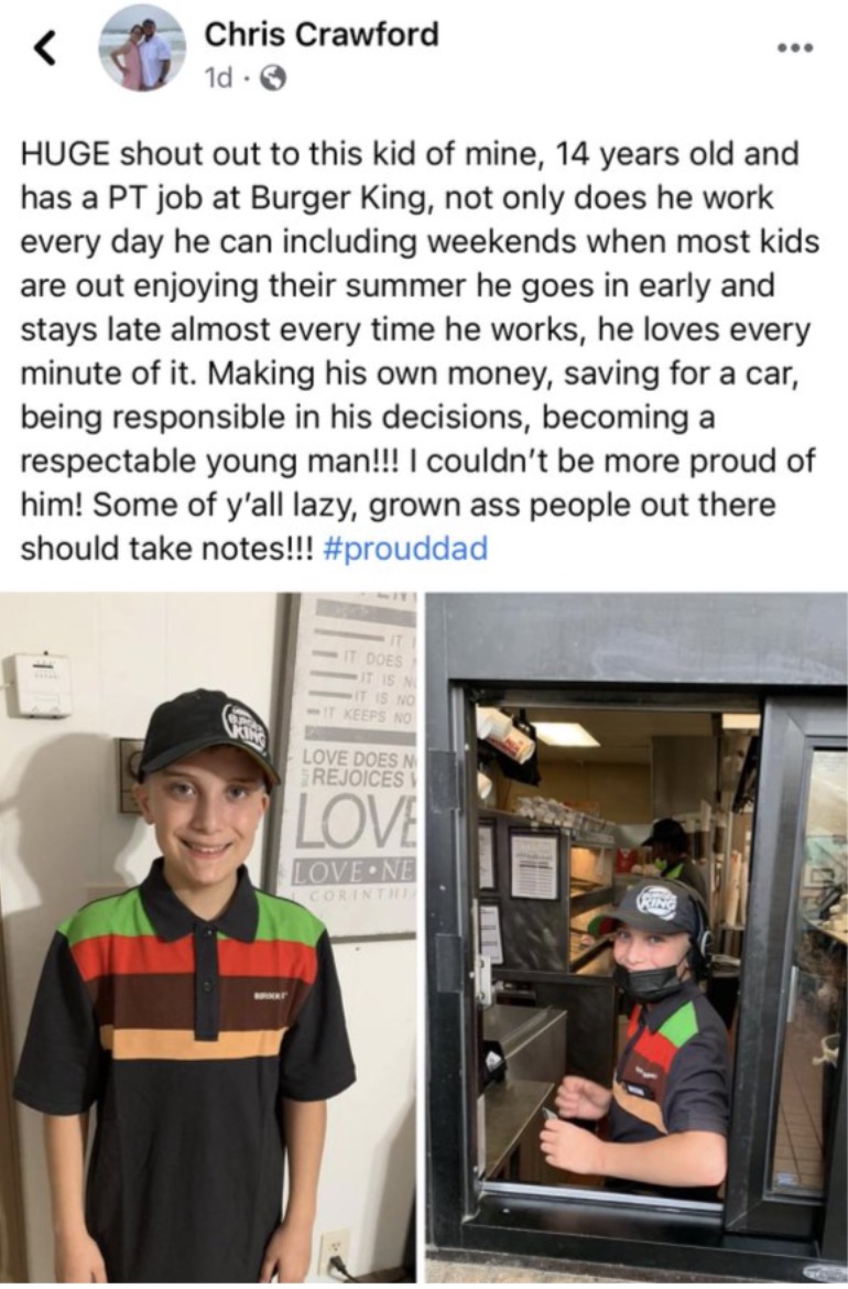 A happy parent posted pictures of his kid at his first job. The boy’s father, Chris Crawford, penned an essay in which he talked about how the young teen’s work ethic may help some adults.