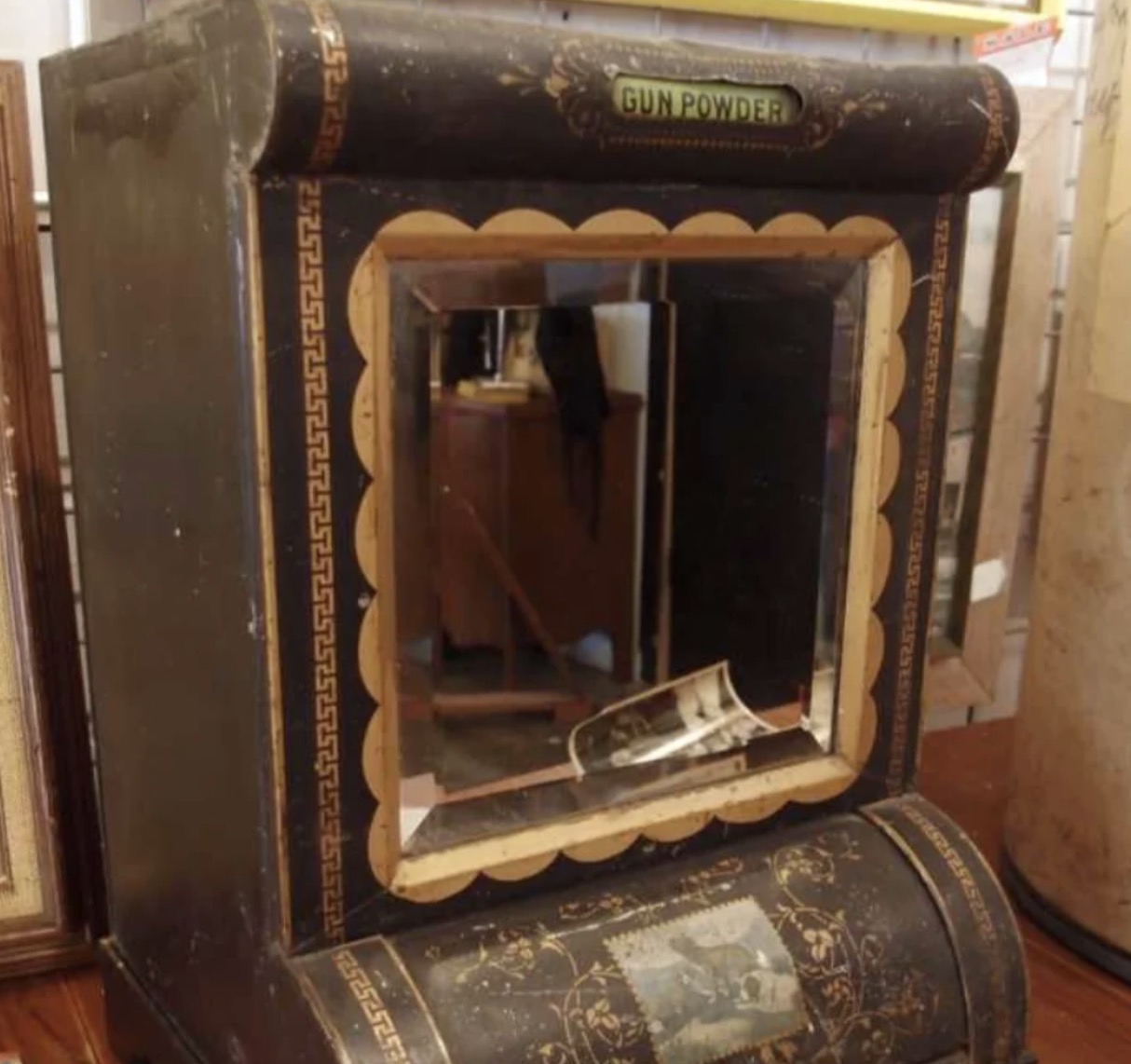 Feast your eyes on this metal box with ornate gold stenciling and a beveled glass front. It even has a small sliding door with a picture of some dogs. What do you think it was used for?