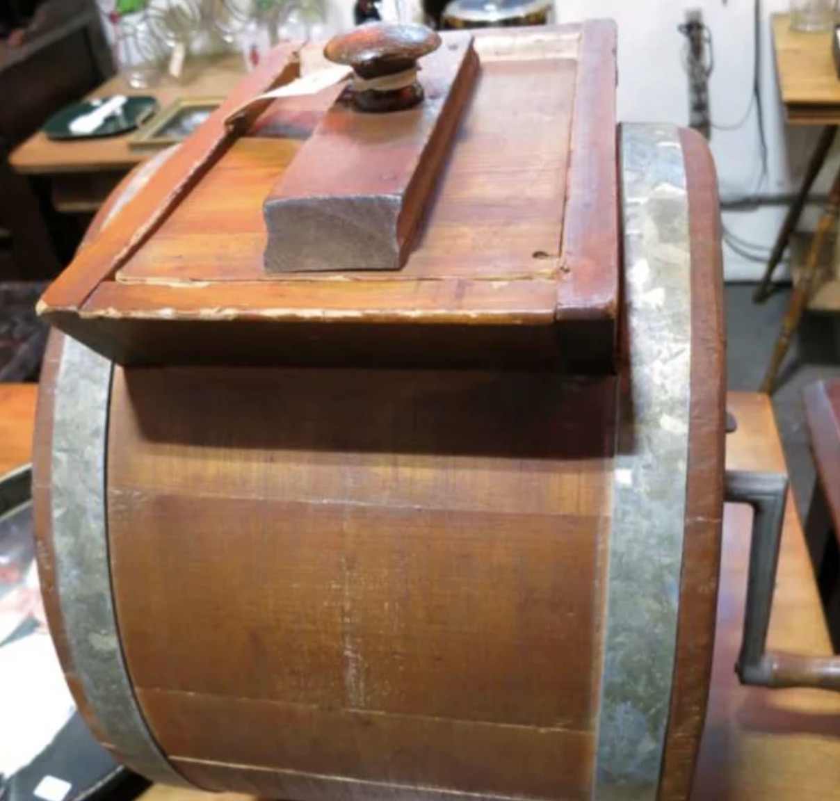 Look at this large wooden drum with a lid, handle, and a footed base. It even has a crank on the side. Any thoughts on its purpose?