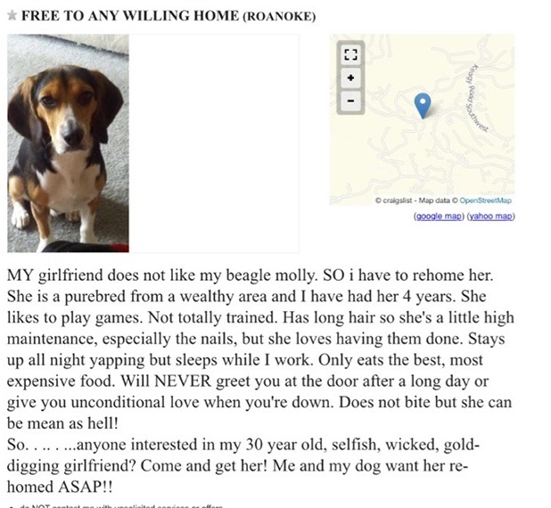 “My beagle Molly is not popular with my girlfriend. So, I must find her a new home. I’ve owned her for four years, and she is a purebred from an affluent neighborhood. She enjoys playing games. not fully qualified. She is a little high maintenance because of her long hair, especially her nails, but she enjoys getting them done. yaps all night long yet falls asleep while I’m at work. only consumes the most costly, finest cuisine. won’t ever welcome you home after a hard day or show you unconditional affection when you’re feeling bad. does not bite, but she has a helluva temper!