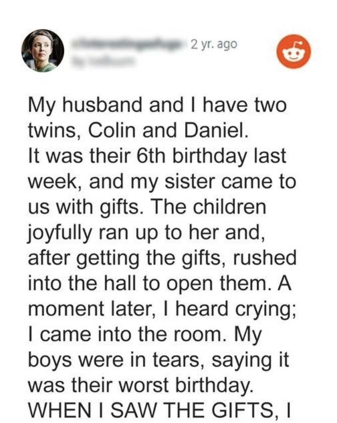 Seeing the presents, I was surprised – my sister had made a grave blunder in picking presents for Colin and Daniel on their sixth birthday celebration. Rather than the standard superb toys and games, she gave them indistinguishable sets of dress – dull, plain, and unacceptable for a birthday festivity.