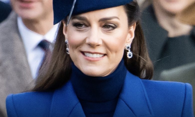 For the holiday occasion, Princess Catherine was elegantly dressed in a long, vibrant blue coat by Alexander McQueen, meticulously tailored with a cinched waist and pronounced shoulders, complemented by a deep blue turtleneck sweater underneath.