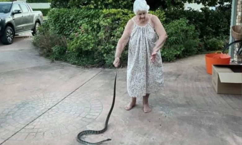 “My mum is bloody amazing,” her daughter commented online, posting a photo of her standing in her driveway, holding the snake by its tail and investigating a bite on her arm.