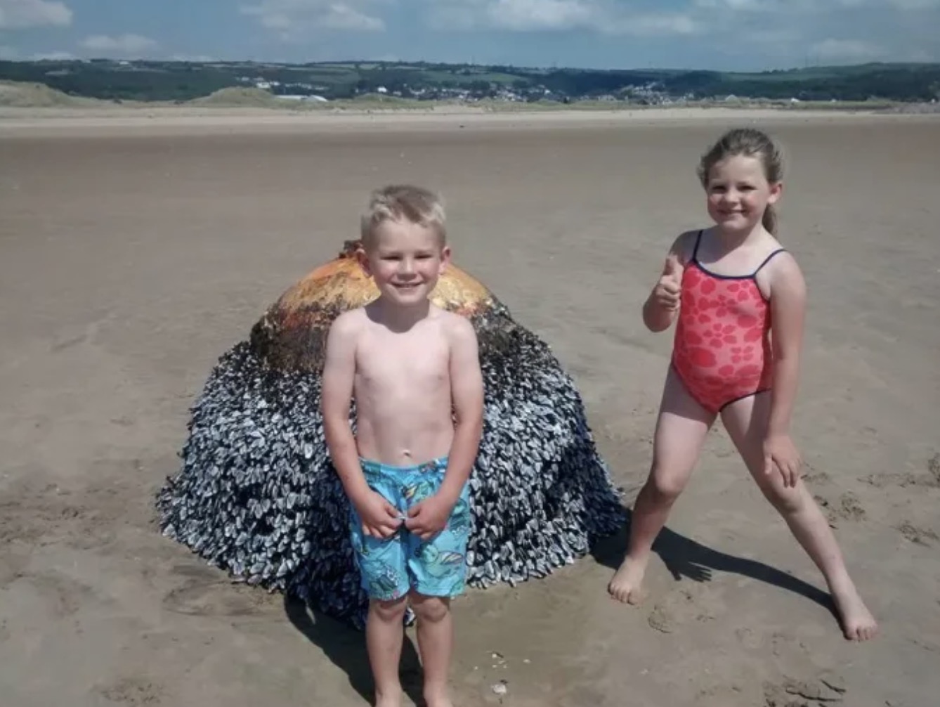 The father, Gareth, took to Twitter to express his surprise, sharing images of his children playfully interacting with the disguised explosive. His tweet humorously noted, “So the buoy my kids were jumping on all weekend turns out to be a WWII bomb. Oops.” Ms. Gravell also recounted that during their beach outing, they were more interested in the barnacles on the object than its true nature. With the tide up, the family had unintentionally stumbled upon the historic bomb, dismissing it as a buoy. Even a light-hearted comment about it being a “big bomb” was made at the time without a second thought.