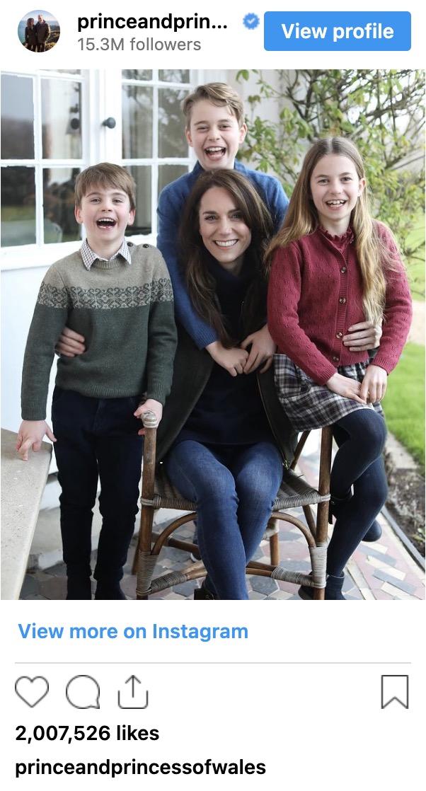 It all started on Mother’s Day when Kensington Palace released a photo of Kate sitting on a patio with her three children, Prince George, Princess Charlotte, and Prince Louis. The caption, signed by “C,” indicated that Kate herself had written it and thanked everyone for their support during her recovery from planned abdominal surgery in January.
