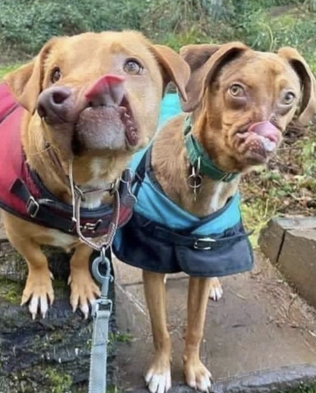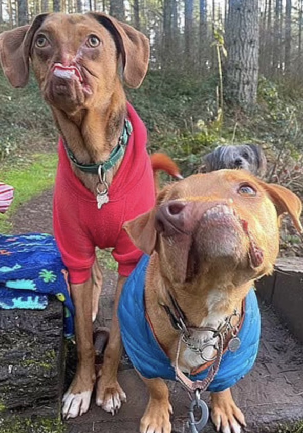 Picasso and Newt – 2 dogs that have facial deformities live with 53-year-old Founder and director of Luvable Dog Rescue Liesl Wilhardt on 55 acres of land at their home in Eugene, Oregon. Picasso was adopted by Liesl in 2017 following the tragic passing of his sibling Pablo, then Newt came into Liesl’s household in 2021. Now, these 2 canines are virtually inseparable, according to their owner.