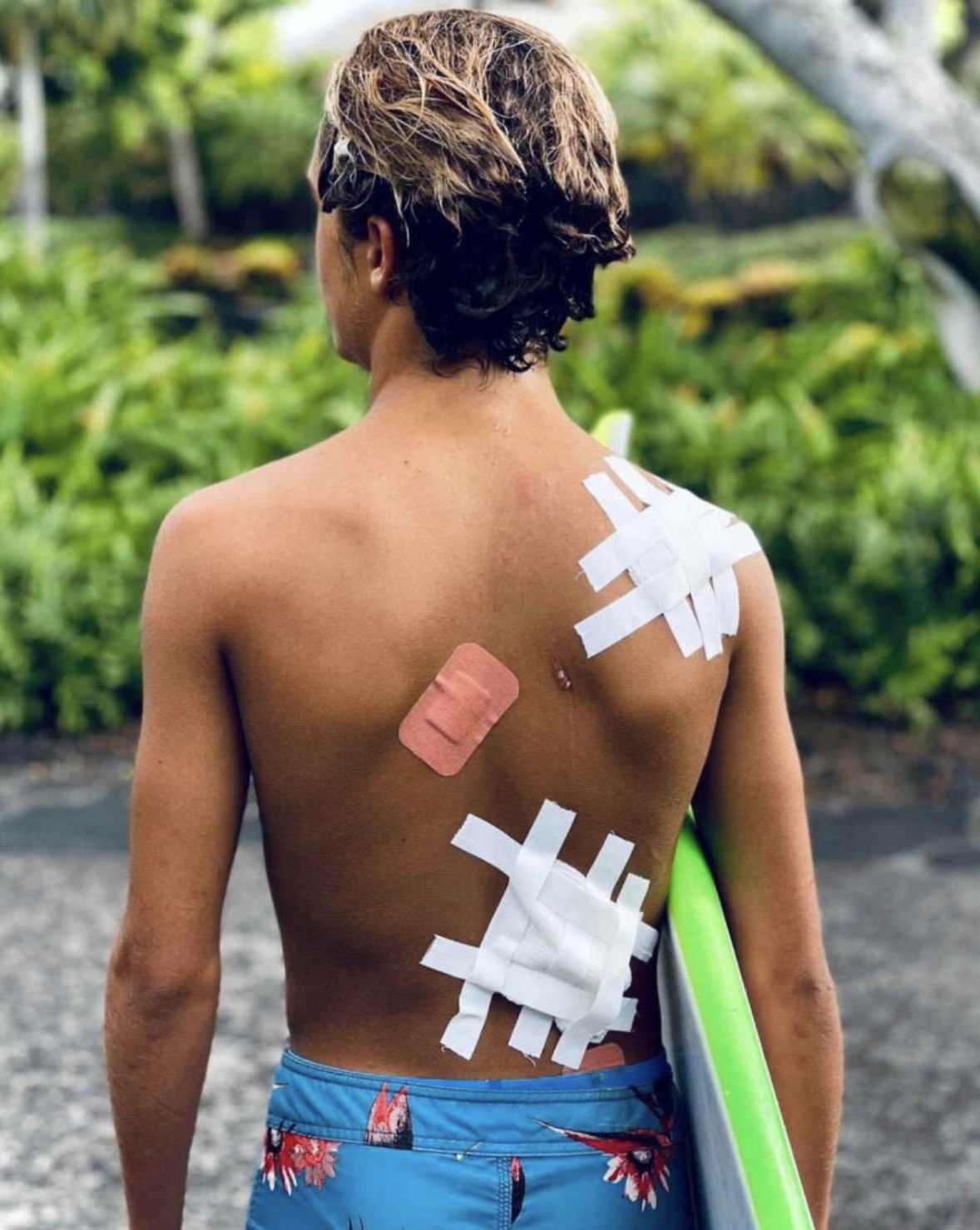The social media images show Levi, 14, standing next to his neon-green surfboard. The child is facing away from the camera, and several big white bandages are covering the exposed skin on his body. Moreover, he has a tiny pink plaster in the center of his back.