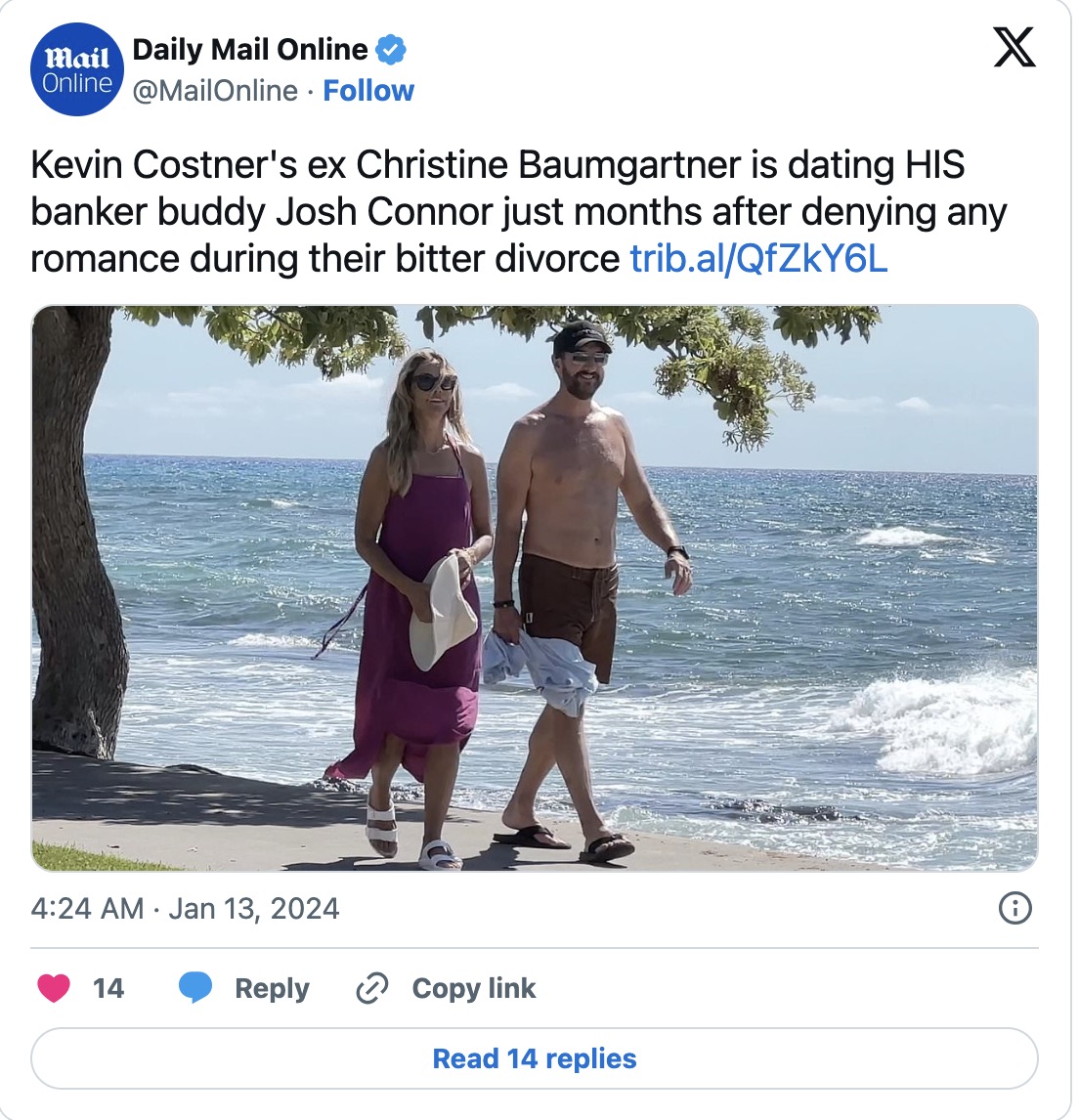 After the divorce finalization, Christina Baumgartner had started to her relationship with Josh Conner, who was the neighbor of Costner, and was divorced few months before Kevin and Christine got divorced.