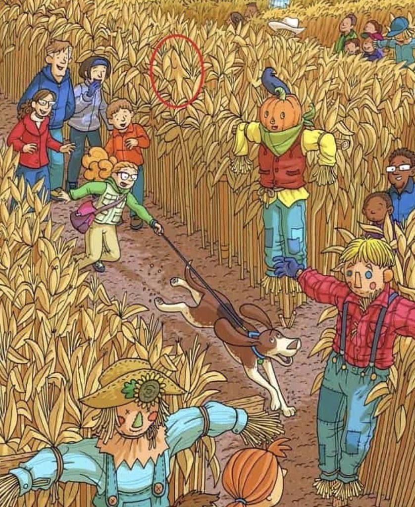 The image presents a delightful scene of people enjoying playful activities in the enchanting cornfield. Yet, within this idyllic setting, a cleverly camouflaged fish lies hidden.