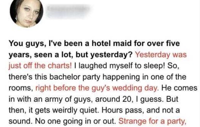 Hotel workers often witness wild parties, but one particular bachelor party took an unexpected turn. A large group of guys checked into a hotel room for a pre-wedding celebration. Strangely, there was complete silence throughout the night. Hours later, the groom’s fiancée arrived, searching for her soon-to-be husband. She had his phone, which he had left behind. The hotel staff accompanied her to the room, only to find the groom and his friends fully clothed in the bathtub, engaged in a bizarre toy boat “naval battle.” This unexpected sight led to the cancellation of the wedding. Talk about a surprising end to a bachelor party!