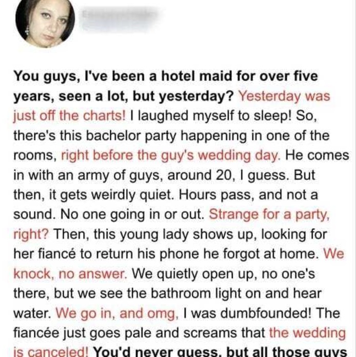 Hotel workers often witness wild parties, but one particular bachelor party took an unexpected turn. A large group of guys checked into a hotel room for a pre-wedding celebration. Strangely, there was complete silence throughout the night. Hours later, the groom’s fiancée arrived, searching for her soon-to-be husband. She had his phone, which he had left behind. The hotel staff accompanied her to the room, only to find the groom and his friends fully clothed in the bathtub, engaged in a bizarre toy boat “naval battle.” This unexpected sight led to the cancellation of the wedding. Talk about a surprising end to a bachelor party!