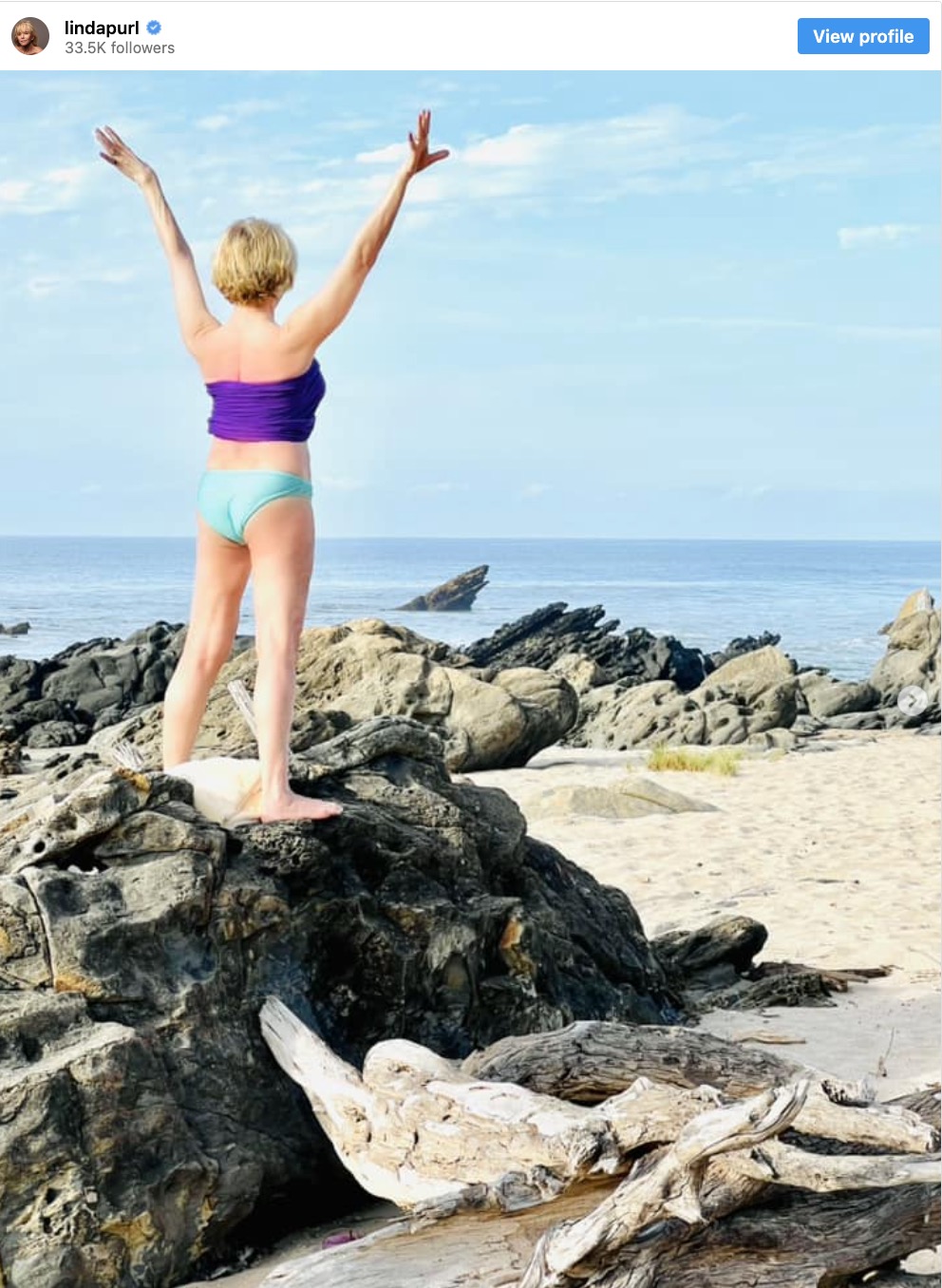 Purl posed as she rose her hands up in her purple swimsuit top and turquoise bottoms. She displayed her legs in the picture.