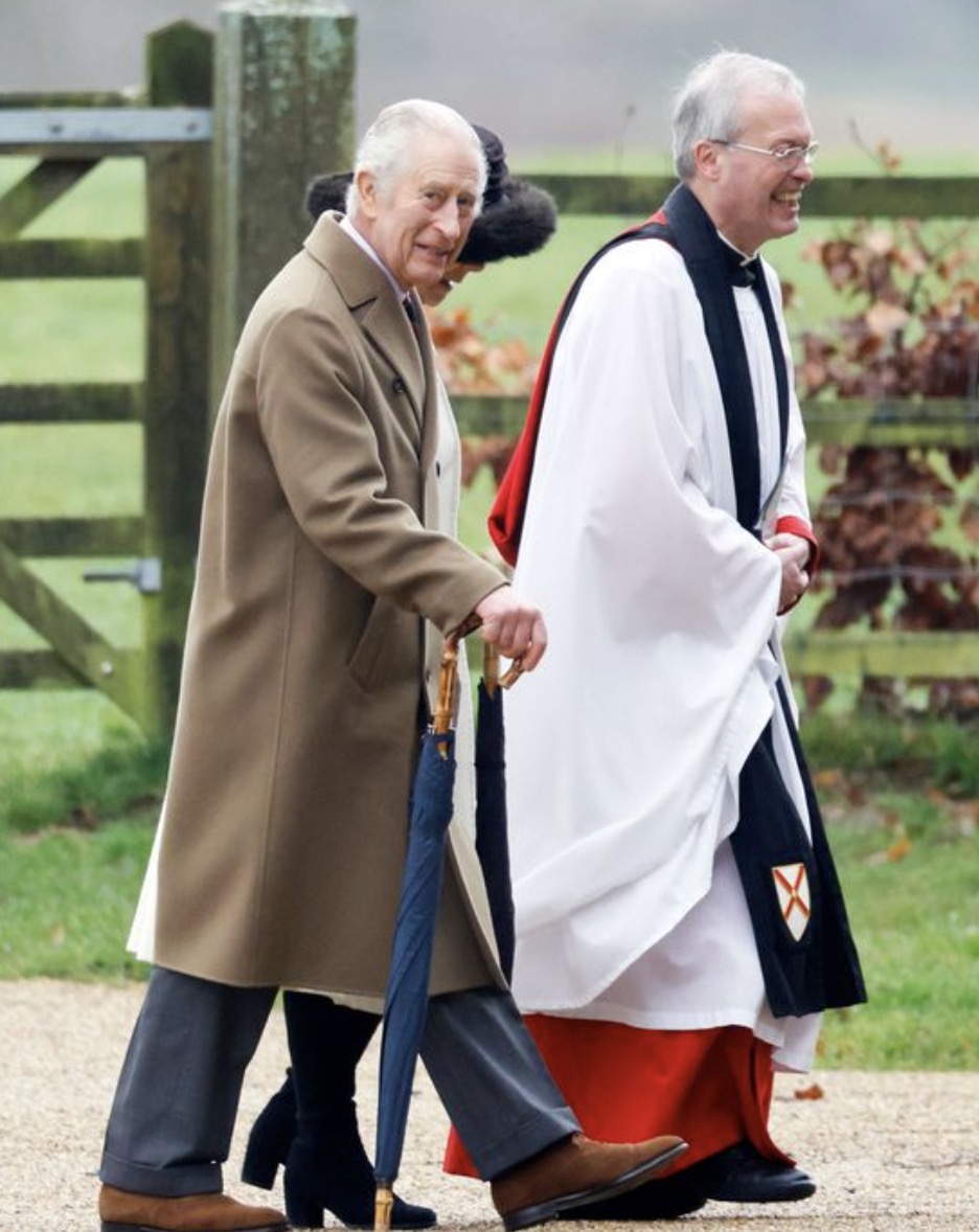 King Charles was seen at the Sunday service at the Church of St. Mary Magdalene in Sandringham, on the 11th of February, where he was wearing a brown trench coat, and gray slacks. His wife, Queen Camilla was walking with her, as The Reverend Canon Dr. Paul Williams.