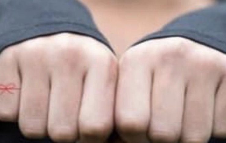 To learn more about the red string tattoo in question, I used the internet. In Asian countries, it is called the “red string of fate.” The tattoo looks like a simple bow with tails, like a shoelace that is tied. It usually shows up on a man’s thumb and a woman’s pinky finger.
