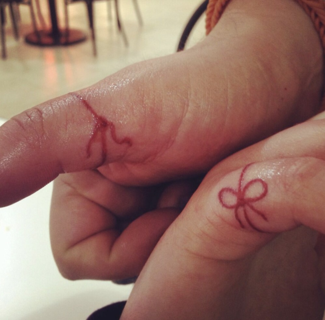 To learn more about the red string tattoo in question, I used the internet. In Asian countries, it is called the “red string of fate.” The tattoo looks like a simple bow with tails, like a shoelace that is tied. It usually shows up on a man’s thumb and a woman’s pinky finger.