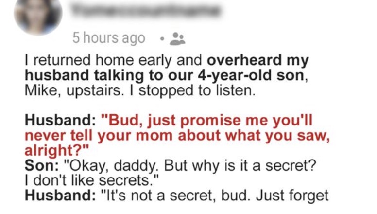 I accidentally overheard husband telling our son not to reveal what he had witnessed to me