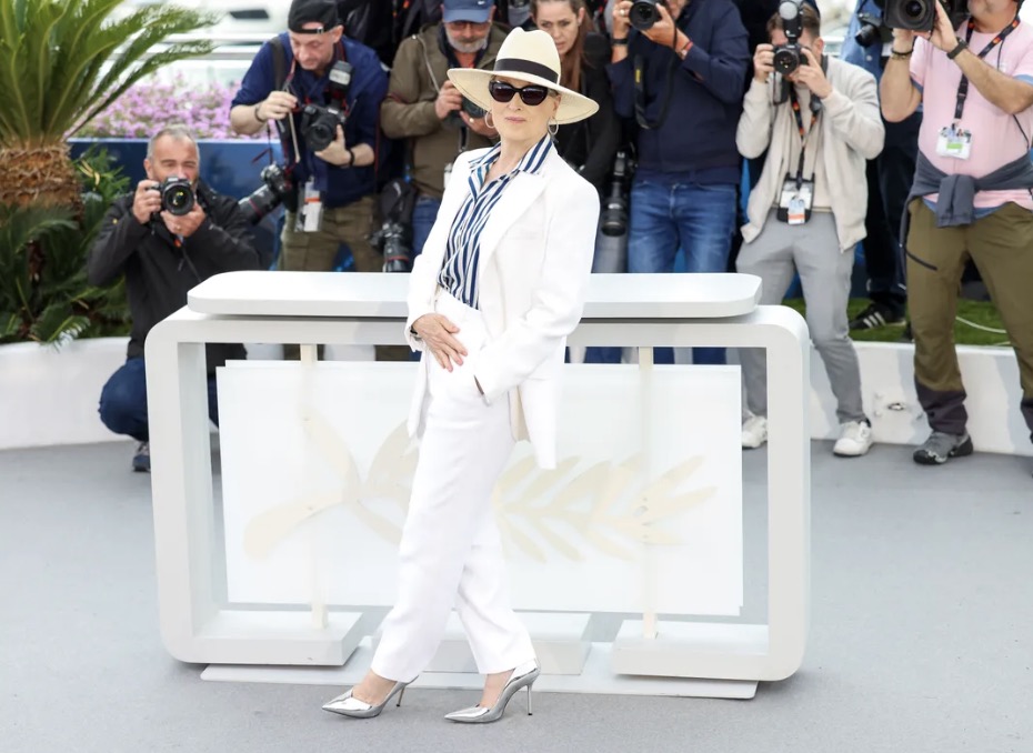 At the opening photocall, Streep embodied Riviera chic in a Michael Kors white suit, complemented by a navy-and-white striped blouse from Lilysilk. She completed her look with silver Jimmy Choo pumps, Prada sunglasses, hoop earrings, and a Gigi Burris woven hat.