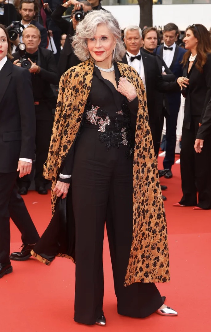 Jane Fonda charmed the crowd with her bejeweled black suit with silver floral appliques and a tan and black animal print coat. Her silver hair, styled in soft waves, and bright red lipstick contrasted beautifully with her outfit. She accessorized with Pomellato jewelry and silver stilettos.