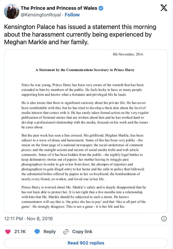 Reportedly, the Royal Family’s website no longer features Prince Harry’s 2016 critique of the British press for the “racial undertones” in commentary about his then-girlfriend, Meghan Markle. This statement, which had been online for seven years, has been removed but is still visible on the official X page of the Prince and Princess of Wales.